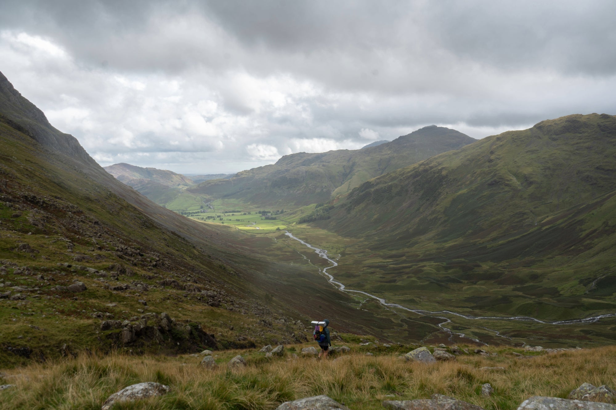 We were in the throes of a serious discussion about whether or not we could safely continue when, miraculously, it stopped raining. During this brief respite, we poked our heads up from under the wall where we were sheltered to see the entire Langstrath valley stretched out before us. I wouldn’t say it was sunny but there was definitely more light than we had seen for the last few hours. This glimpse gave us all the hope that we needed. We came to a consensus: Let’s keep going.